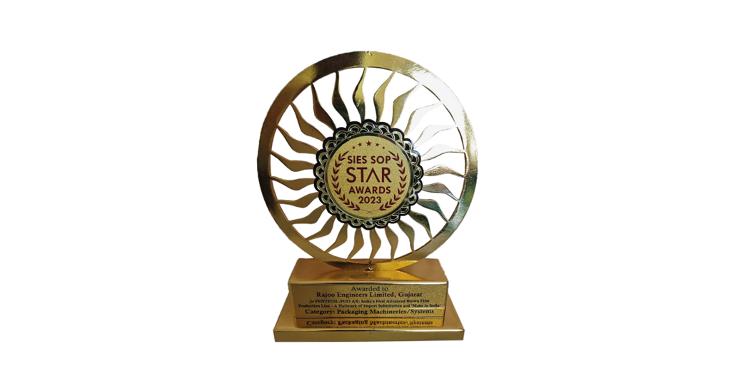 Rajoo Engineers Ltd, a pioneering force in the field of plastic processing machinery, has been recognized with the prestigious SIES SOP STAR 2023 Award for their groundbreaking innovation, the PENTAFOIL-POD-AX, the five layer (POD) blown film line for flexible packaging. The award from South India Education Society School of Packaging, Mumbai (SIES- SOP), presented in acknowledgment of excellence in import substitution and ‘Make in India’ initiatives, highlights the transformative impact of Rajoo’s indigenous technological advancements.